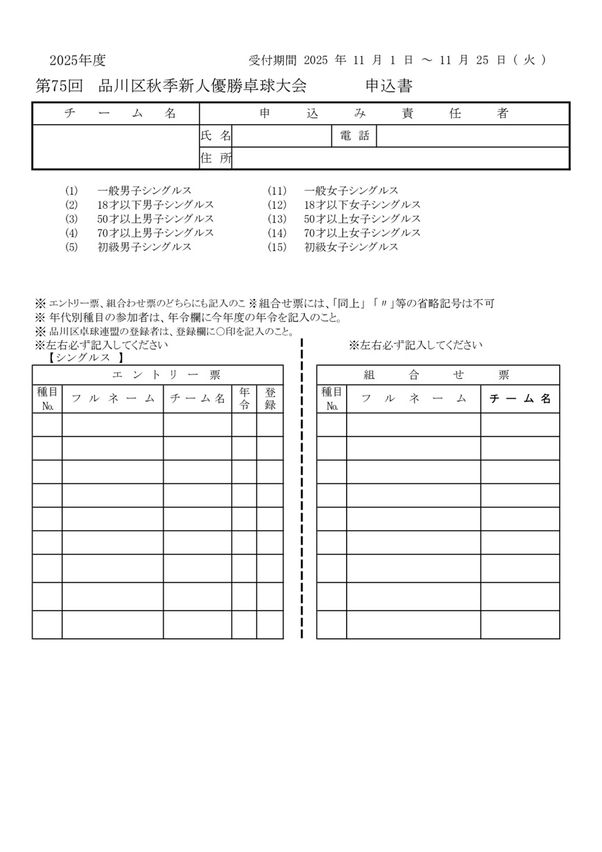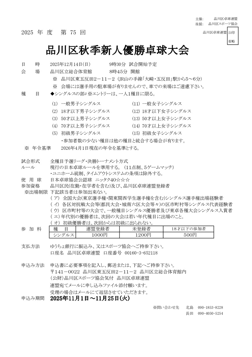 令和7年(2025年)品川区秋季新人優勝卓球大会の要項
